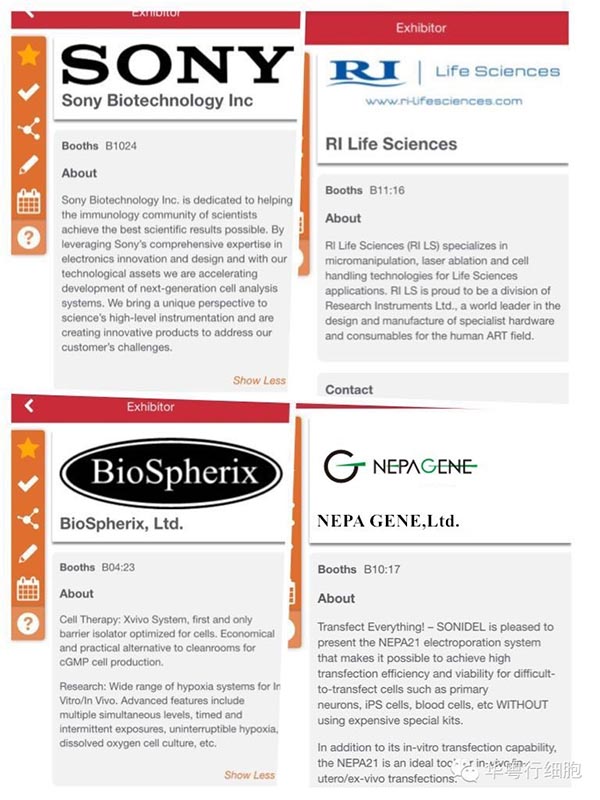 先看一下ISSCR會(huì)議APP上列出的部分廠家,一進(jìn)入就看到我們的廠家SONY、Biospherix、NEPA 、NanoEnTek